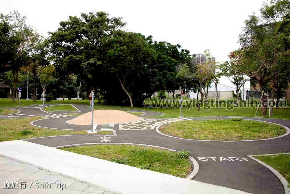兒童滑步車場在另一側,前方有一座土地公廟。這裡的車道有圓環、直線、彎道、波浪等設計,並繪上斑馬線、行進方向等標誌,一旁有一座小型旋轉攀爬架可以玩,下方細礫石可玩沙,成人也有體健設施方便活動筋骨。