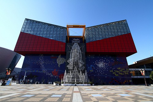 大阪海遊館的外觀也很吸睛,遠看像一艘船,中間有一隻大鯨鯊,前方休憩區也有企鵝等海洋生物造景。