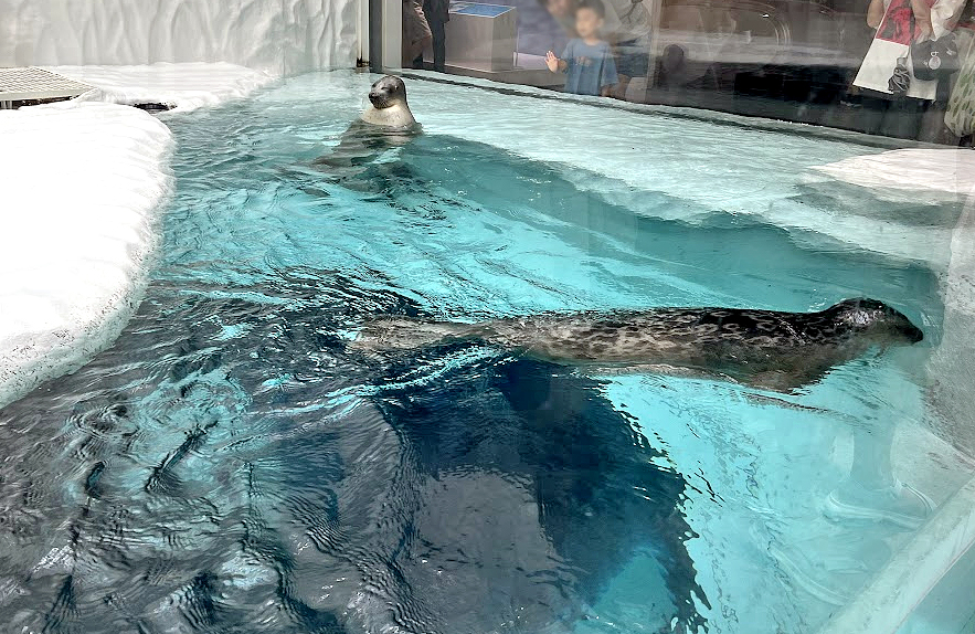 往北繞行來到了北極圈,冰山設計讓整個環境多了冰冷感;在這裡可以看到海天使、北極紅點鮭等,抬頭還有環斑海豹在游泳。