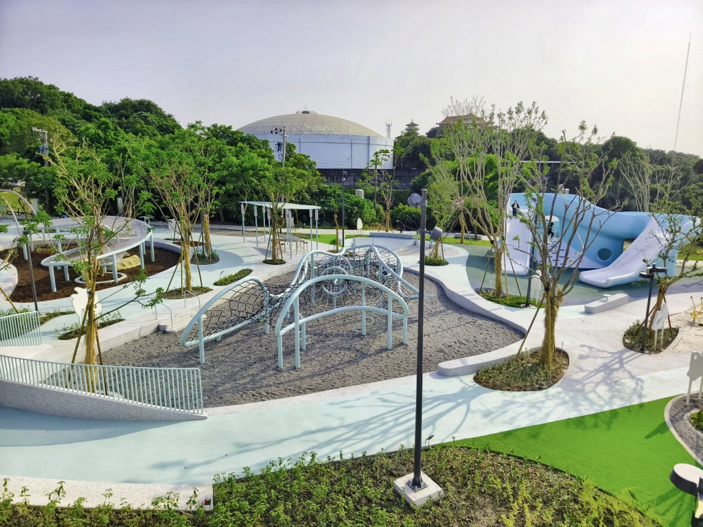 遊戲場內分為7座主題遊具,仿雲朵外型的溜滑梯,有著漂亮的流線外觀,設置高低2座磨石子滑梯與攀爬牆;雲之攀爬架也是以流線設計,非平面爬網增加了困難度,挑戰小朋友的平衡力;飄浮繩網的網格較細,適合小小孩攀爬遊玩。