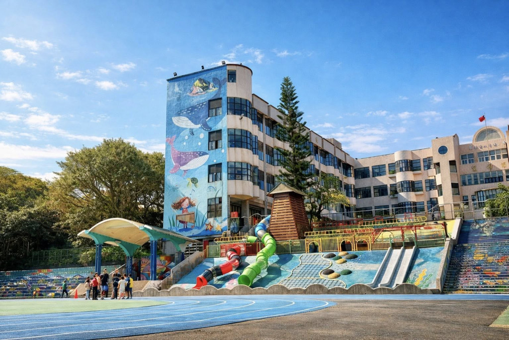 校園遊戲場非常吸睛,在校門口就可以看到,順著斜坡建置而上,有2座水管溜滑梯、2座磨石子溜滑梯,上下2層的區域設置岩石、繩網、單索、斜坡木梯等攀爬設施,小朋友上下爬不停,可以耗去不少電力;另一側還有一座較低矮的溜滑梯遊戲組,適小小孩玩。