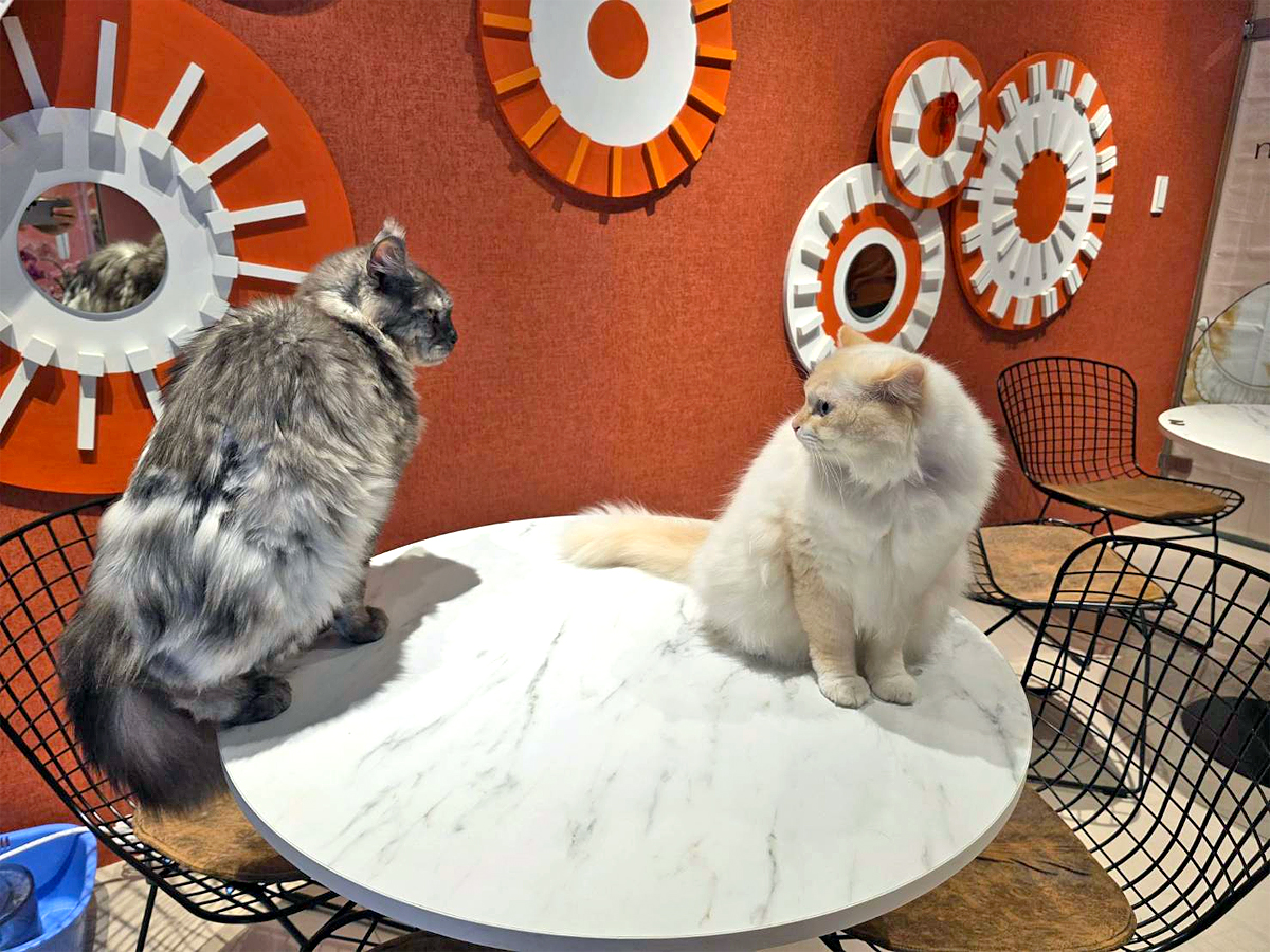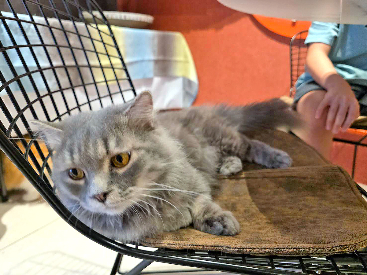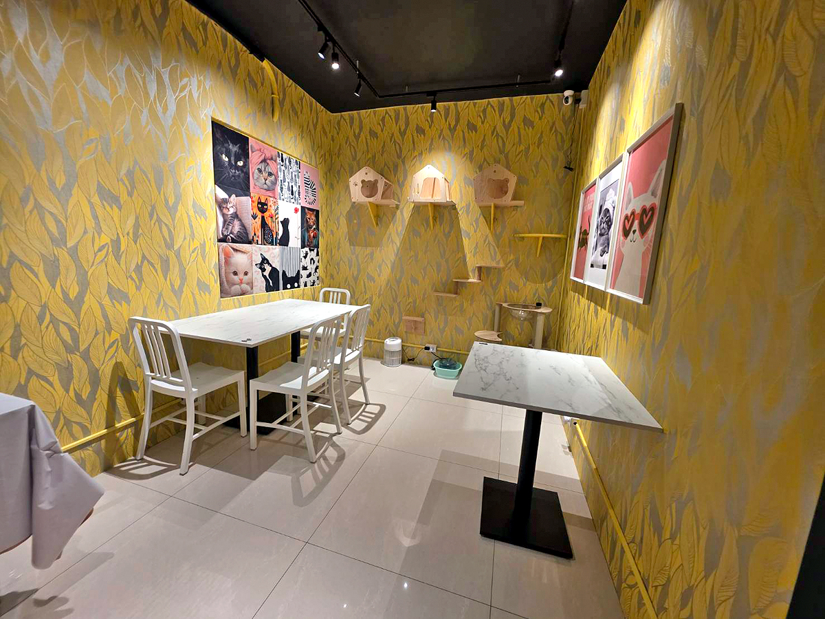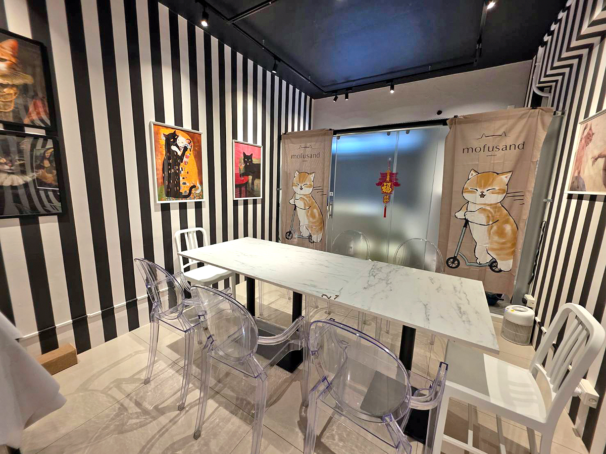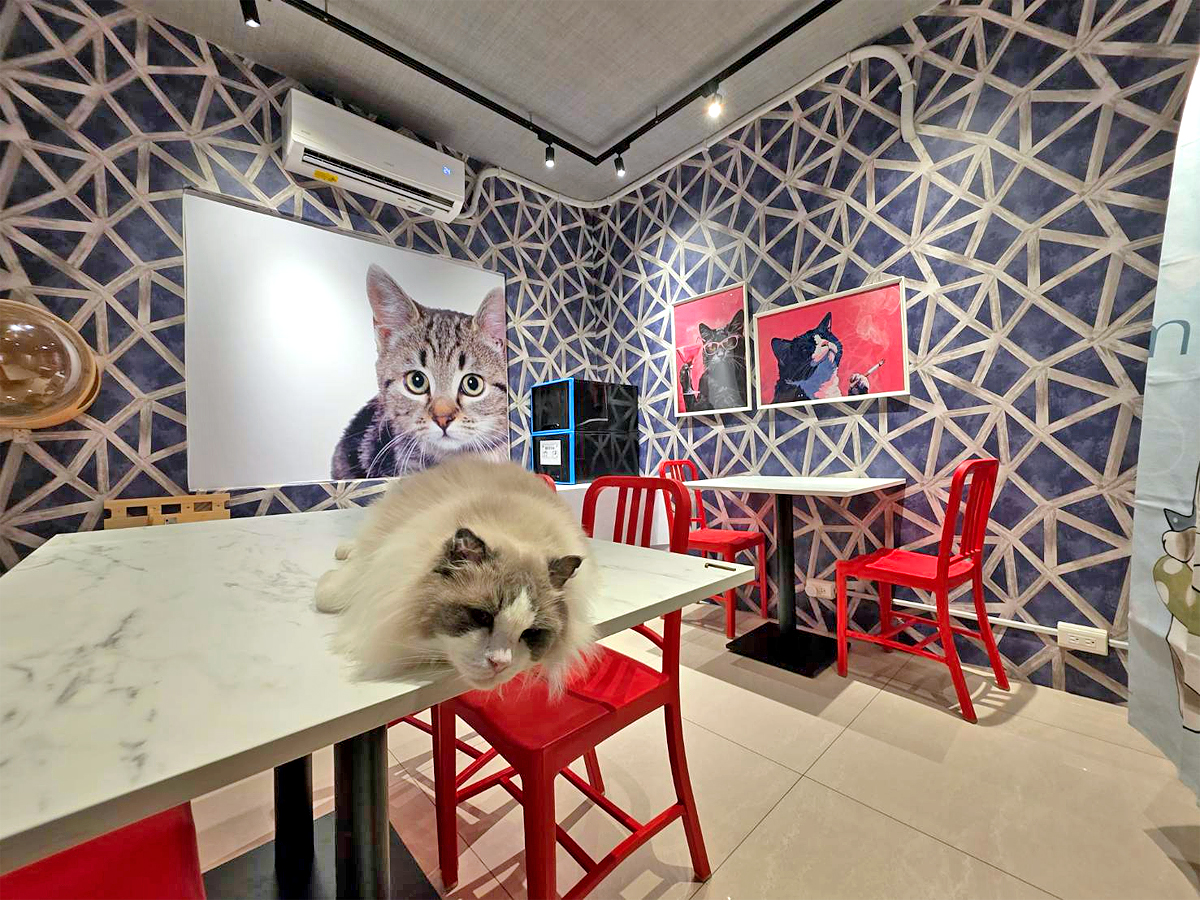 餐廳裝潢利用幾何圖案增加設計感,牆面上則佈置貓咪圖案、畫框;貓咪們自在的在裡面活動或休息,親人的牠們會主動討摸;有時還會佔據你的位置,可愛的模樣讓人捨不得請牠離開。喜愛貓咪的大小朋友,可以來這裡感受被貓咪包圍的幸福。