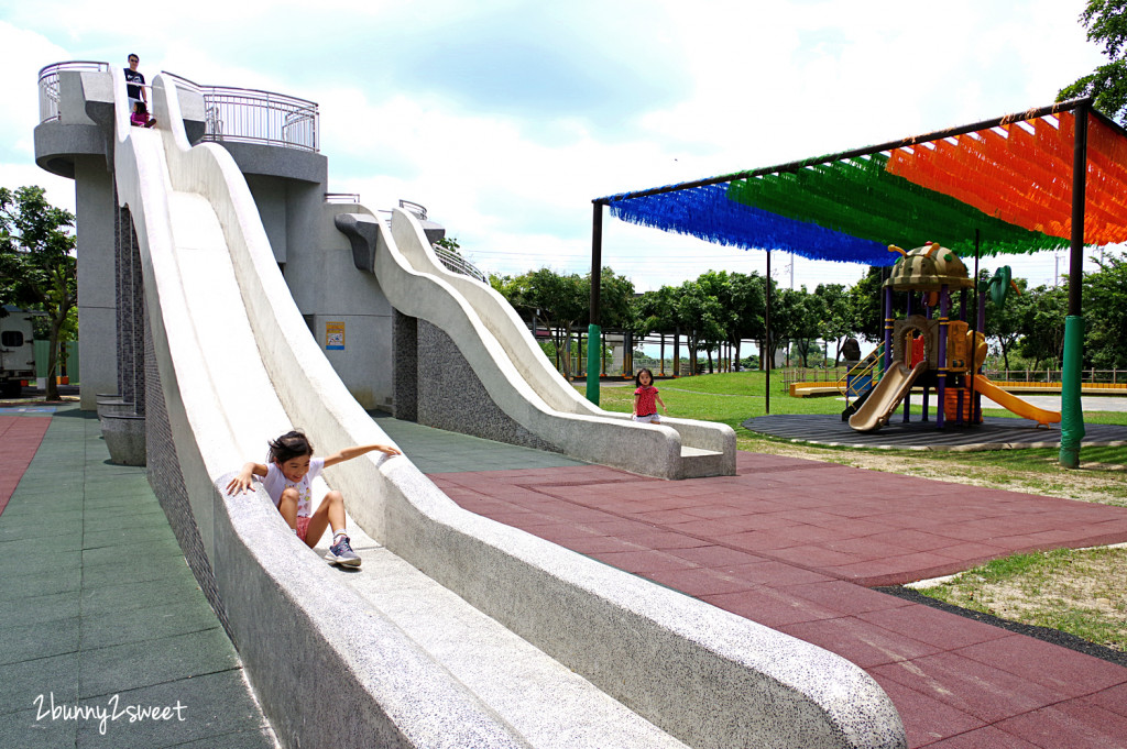 全新的溜滑梯以大象為意象,有一高一低二個滑道,最高的有5.5公尺高,溜下去真的夠刺激的,而滑梯平台上不僅可以欣賞葫蘆埤湖光景色,還可以清楚看到呼嘯而過的高鐵,若同行的幼兒不敢玩太高的滑梯,另一側還有小型的塑製滑梯可以玩。