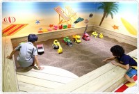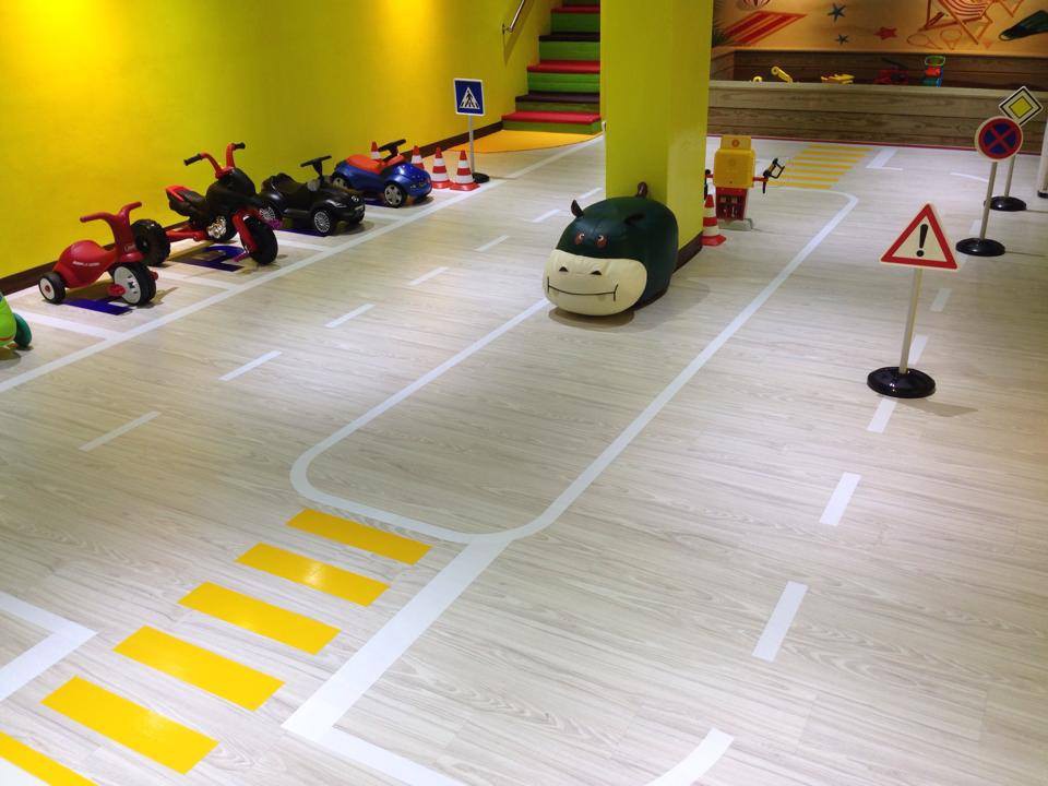 B1地下一樓則有乾淨不沾身的室內決明子沙坑,裡面還提供不少玩沙的車車與工具。另外則保留一大部份做為小朋友玩道路駕駛體驗區,有各項車車、班馬線、道路標誌等,可以來體驗開車停車等模擬駕駛。最後還有一區是桌遊圖書區,有各式成套的書本跟桌遊教具。