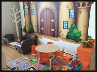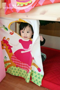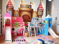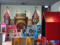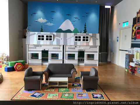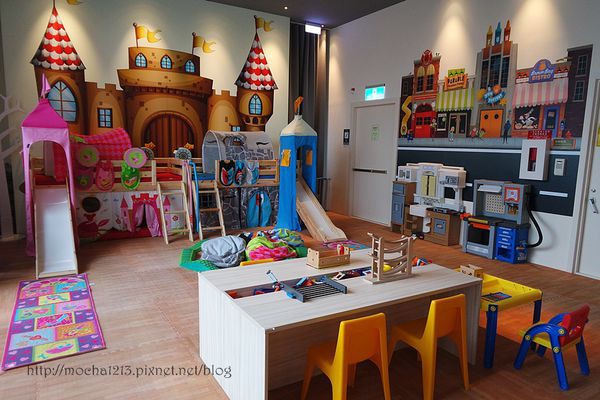 餐廳提供的親子遊戲區裡面有溜滑梯、扮家家酒的廚房組和工作站,還有一些在桌上玩的益智玩具。另外也有一個閱讀小角落放兒童繪本。裡面的家具都是引進丹麥的芙萊莎(FLEXA) 兒童家具,經歐盟認証,無毒又環保。