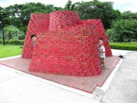 最後來到「火廣場」,這裡有月形廣場開放式空間與國際駐村研習中心,廣場間有一座磚雕公共藝術空間,這個空間也是戲沙區,可以讓小朋友在藝術作品間玩沙。