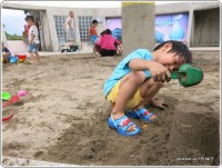 休息區再過去是圓形戲沙坑,沙坑上有遮陽棚,在這裡有沙有水可以玩,小朋友超開心的。