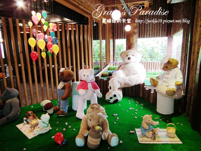 餐廳內也有不少泰迪熊布偶展示,牆壁上也有可愛的泰迪熊壁畫。在餐廳最裡面,有一區小小的兒童遊戲區,貼上森林壁畫、草皮地毯,擺上一隻可愛的泰迪熊布偶,就像來到泰迪熊在森林裡的家。空間不算大,有積木、繪本與一些小玩具,適合小小孩玩。