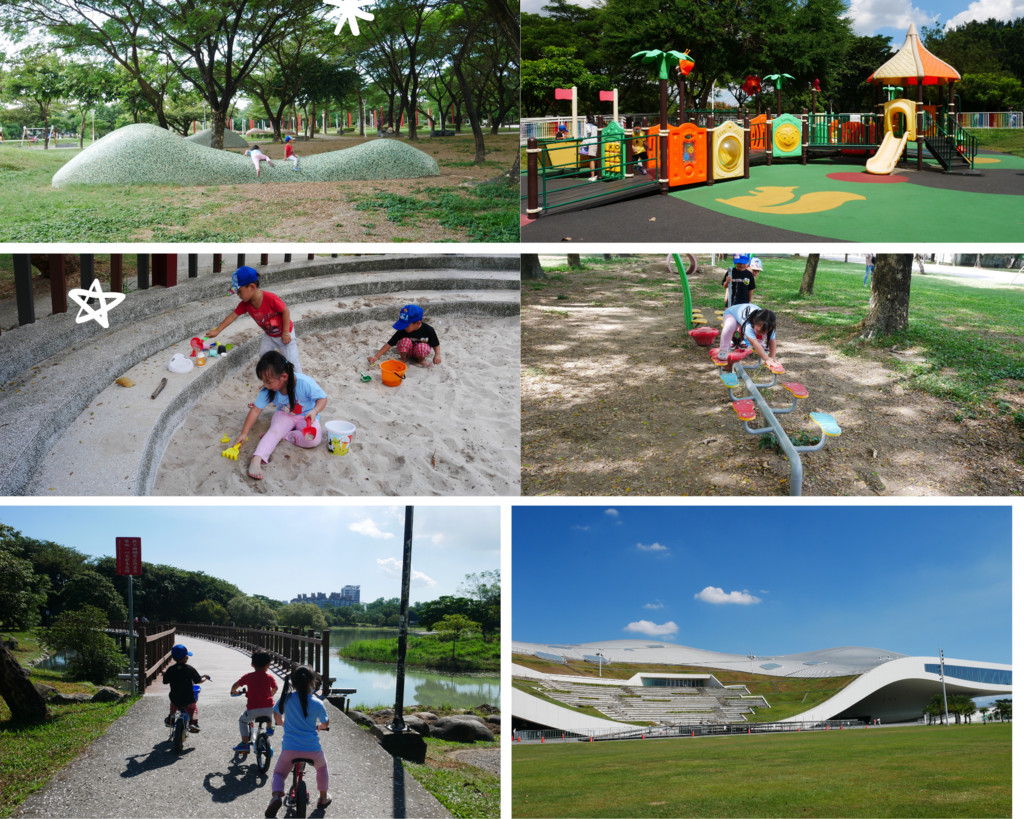 公園裡面分為「自然探索林區、夢境公園區、營區基地、城市花園區、迷彩樂園區、漫遊道」等主題區,其中也有小朋友的遊樂區,最常見家長帶小朋友來大型戲沙池玩沙,另一側有波浪溜滑梯可以玩,旁邊也有不少大樹讓爸媽躲太陽。