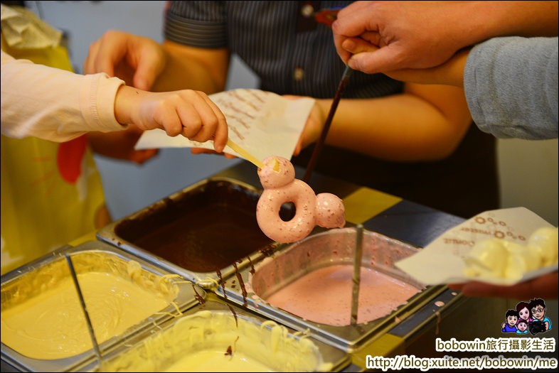 做好造型就可以為甜甜圈上色嘍,其實是沾上醬料,有草莓、巧克力..等,完成自己的甜甜圈,小朋友很有成就感呢。