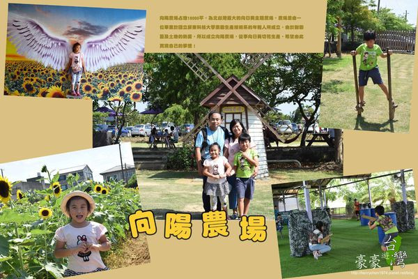 向陽農場位在桃園觀音鄉,佔地18000坪,是北台灣最大的向日葵主題農場,農場內也有種植七彩金魚草、薰衣草等花卉,加上多樣兒童遊樂設施,也有供餐、烤肉,很適合安排為親子一日遊。
