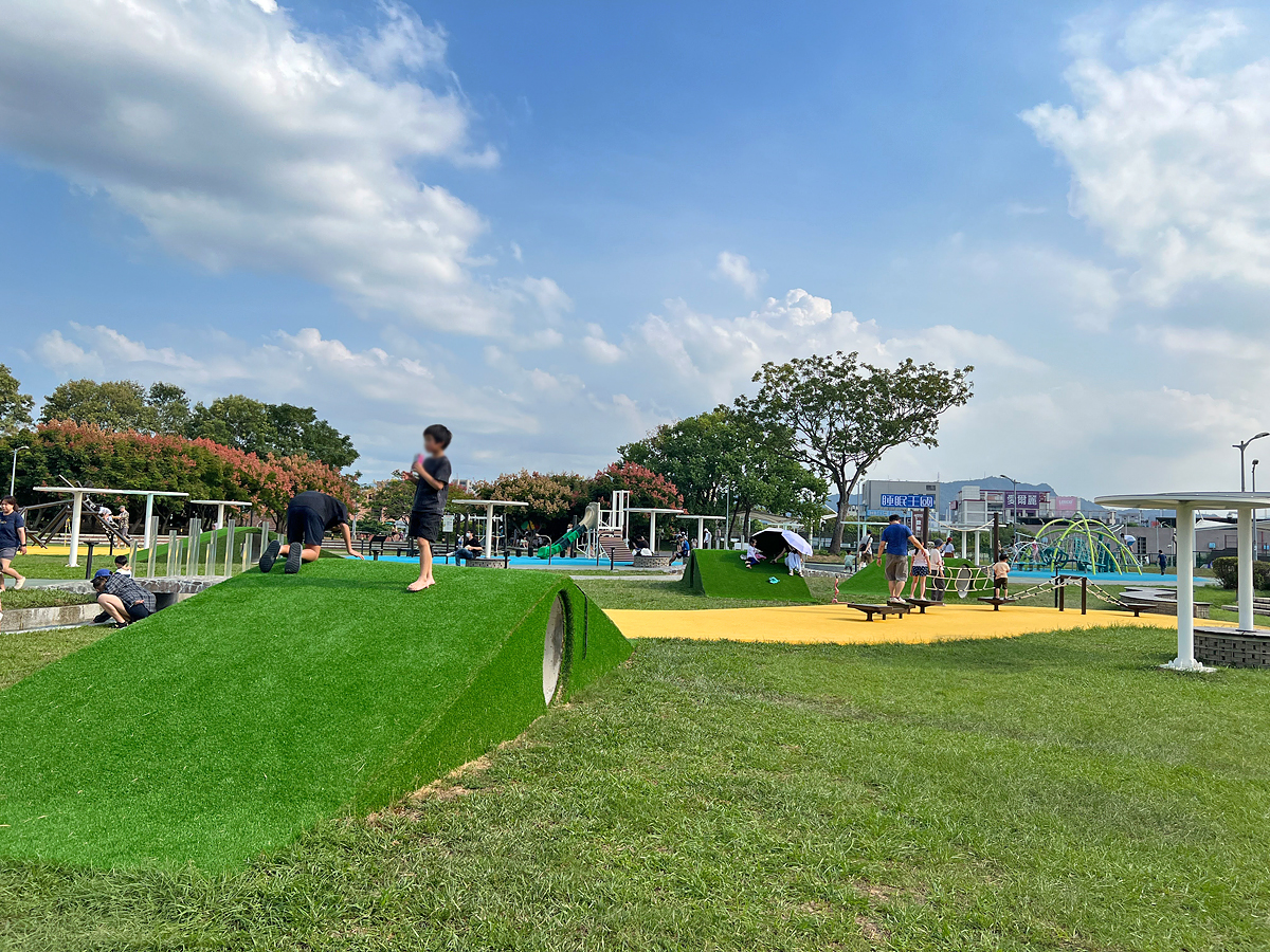 公園內也有大片草皮空間,可以讓小朋友跑跳或玩球類玩具。