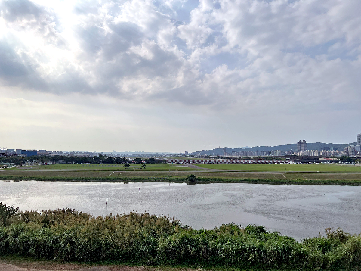 前方正對著松山機場跑道,可以清楚看見飛機起降。