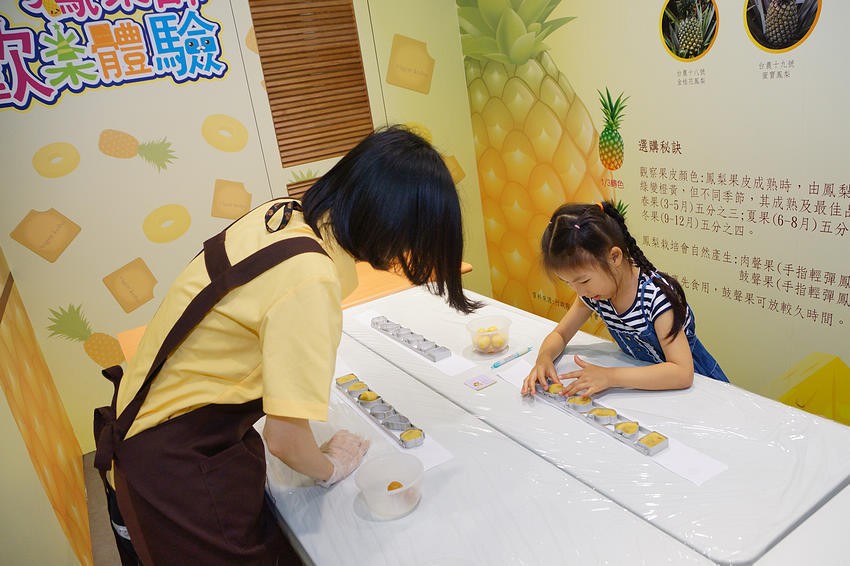 清爽明亮的門市,DIY區就在櫃台後方,每份DIY可做6個不同造型的鳯梨酥,跟著指導人員的步驟操作,先壓餅皮、包餡料、滾圓,最後入模壓整就完成嘍。