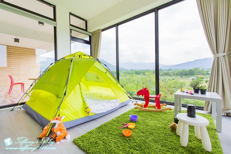 帳蓬房型是直接在客房內搭好帳蓬,前方擺上仿草皮地毯,一旁落地窗外大自然美景,好有在戶外露營的感覺。溜滑梯房型有二間,一間是城堡造型,另一間則是樹屋造型。客房內也有提供玩具與泡澡玩具,小朋友入住這裡,沒有時間喊無聊。