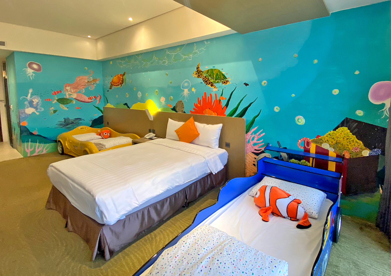 親子房又有不同的主題設計,像是賽車、海底世界、南瓜馬車、小巴士、馬戲團等。