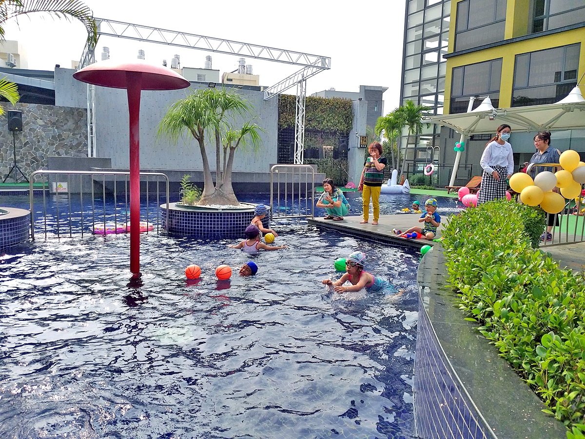 放好行李就可以帶小朋友玩飯店設施,夏天來必玩的就是戶外泳池了,飯店擁有標準泳池與兒童戲水池,小朋友只要泡在裡面都捨不得離開。