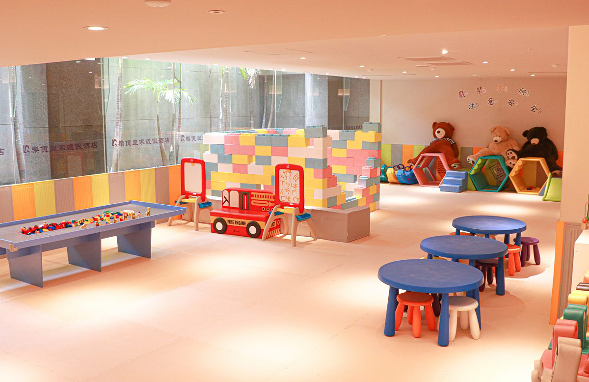 兒童遊戲室位於地下一樓,有積木桌、大積木、感統遊具等,一旁賽車道還有小朋友可以自己開的電動車車;除了遊戲室外,另有書報繪本閱讀區、桌撞球、Switch遊戲機,以及投幣式遊戲機,飯店也有提供腳踏車租借。