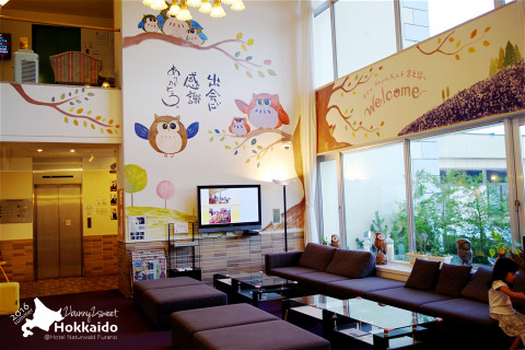 飯店大廳充滿童趣手繪風格,角落設有飲料機、咖啡機供應住客免費享用,大人還有提供免費的化妝水、乳液、面膜等,非常貼心。另外飯店內設有露天風呂,讓你舒緩旅遊一整天的疲勞。