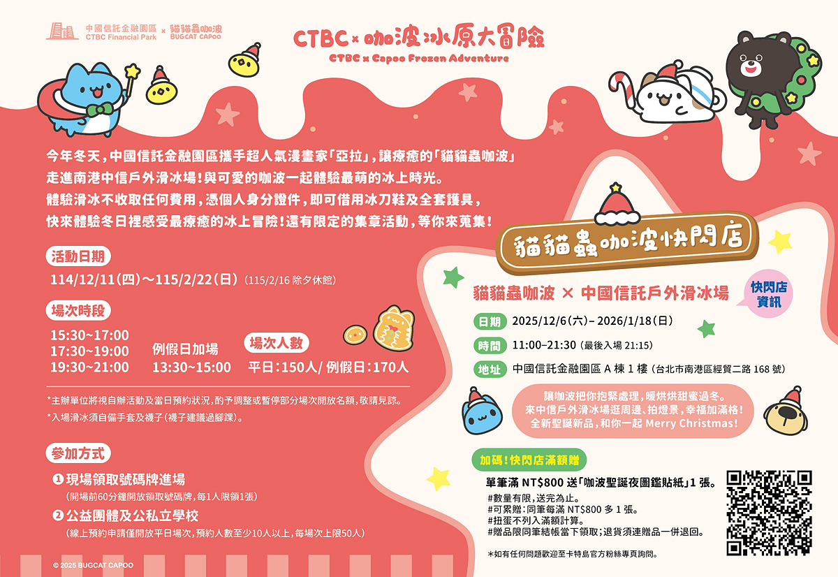 滑冰場開放時間為13:30-15:00(假日場)、15:30-17:00、17:30-19:00、19:30-21:00,每場可容納150人(假日170人),團體10人以上可線上預約,個人則採現場領取號碼牌。2025年開放日期為12/11至2026/02/22;且今年戶外裝置藝術請來人氣IP「貓貓蟲咖波」,可愛又好拍!中信金融園區內有的逛有的吃,滑完冰餓了覓食很方便,且活動期間憑滑冰場號碼牌還能享有園區內特定店家消費優惠。