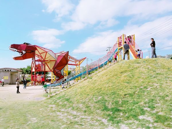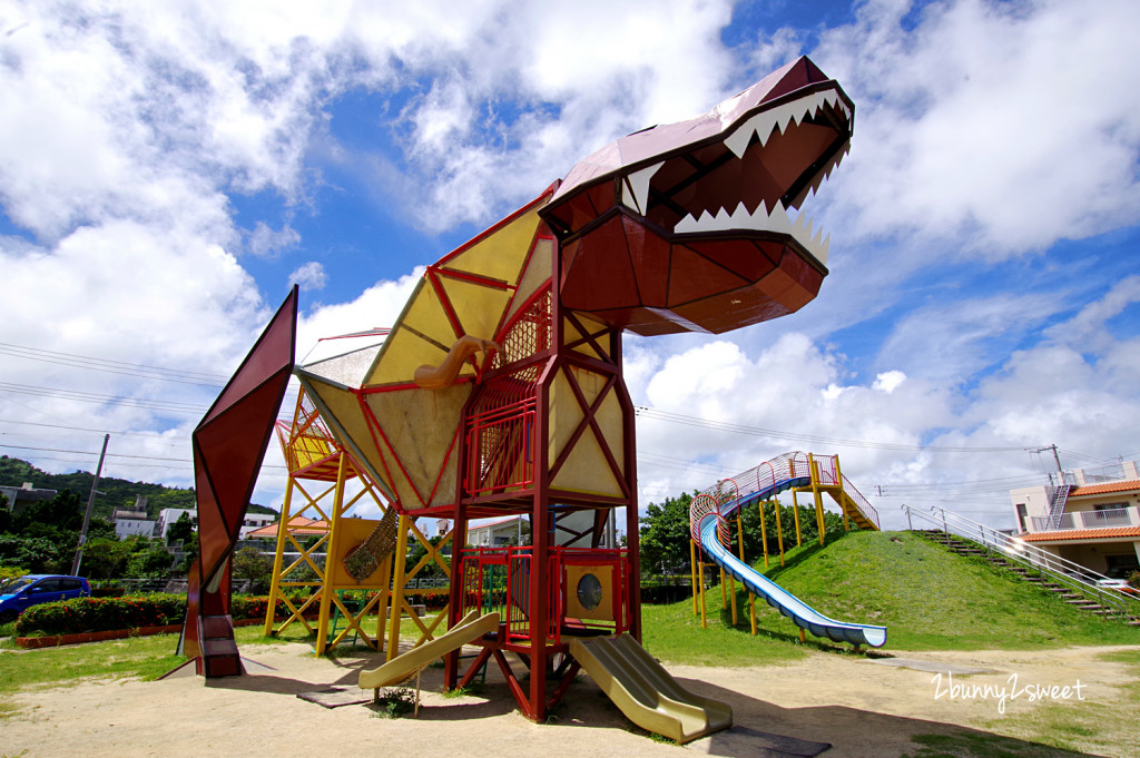 沖繩有不少特色公園,這裡是位在小社區內的東浜恐龍公園,公園內有隻超大暴龍造型兒童遊具,一旁還有超長木片式溜滑梯,帥氣的暴龍最受小男孩歡迎了。